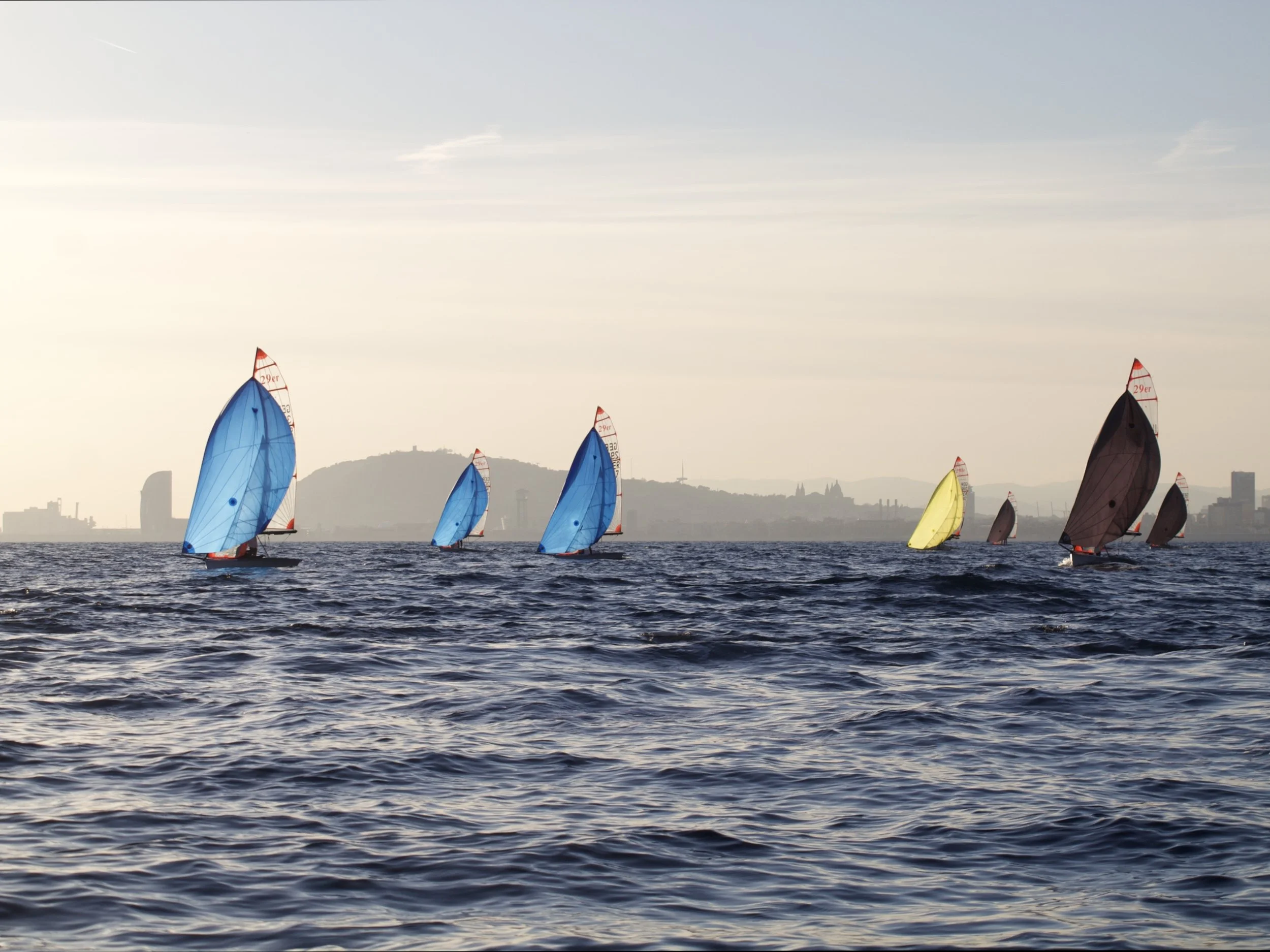 Like every year, our winter training took place in Barcelona, Spain. Our boats were already waiting for us when we arrived on the 17th of December. The temperature was pleasant, and the winds varied. The mornings usually allowed for great conditions even though they were quite cold. We took advantage of these cold mountain winds and usually trained during the early hours. After a lunch break with warm food, we always tried to go sailing a second time, but often the winds were weak. One of the skills we managed to train effectively was steering out waves and being able to maintain perfect speed while sailing against the wave.