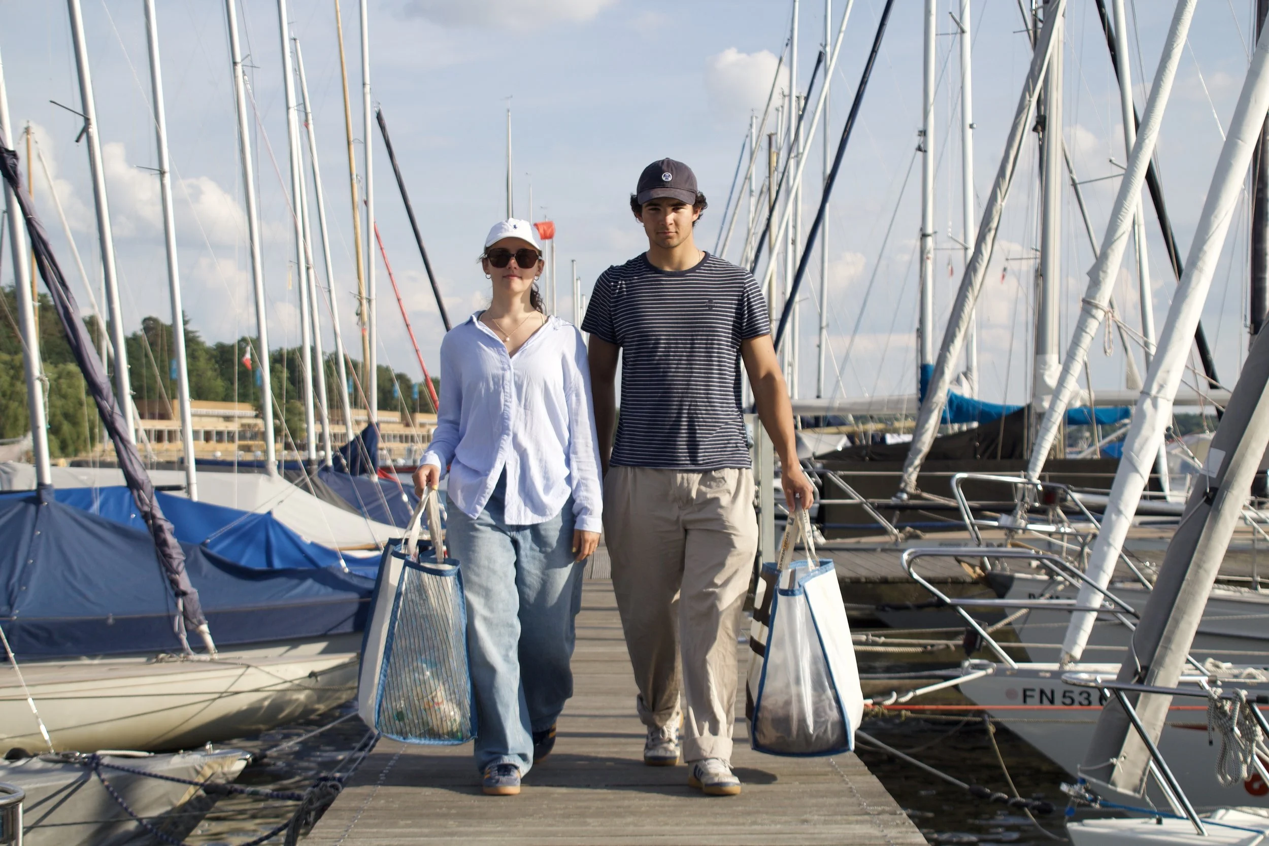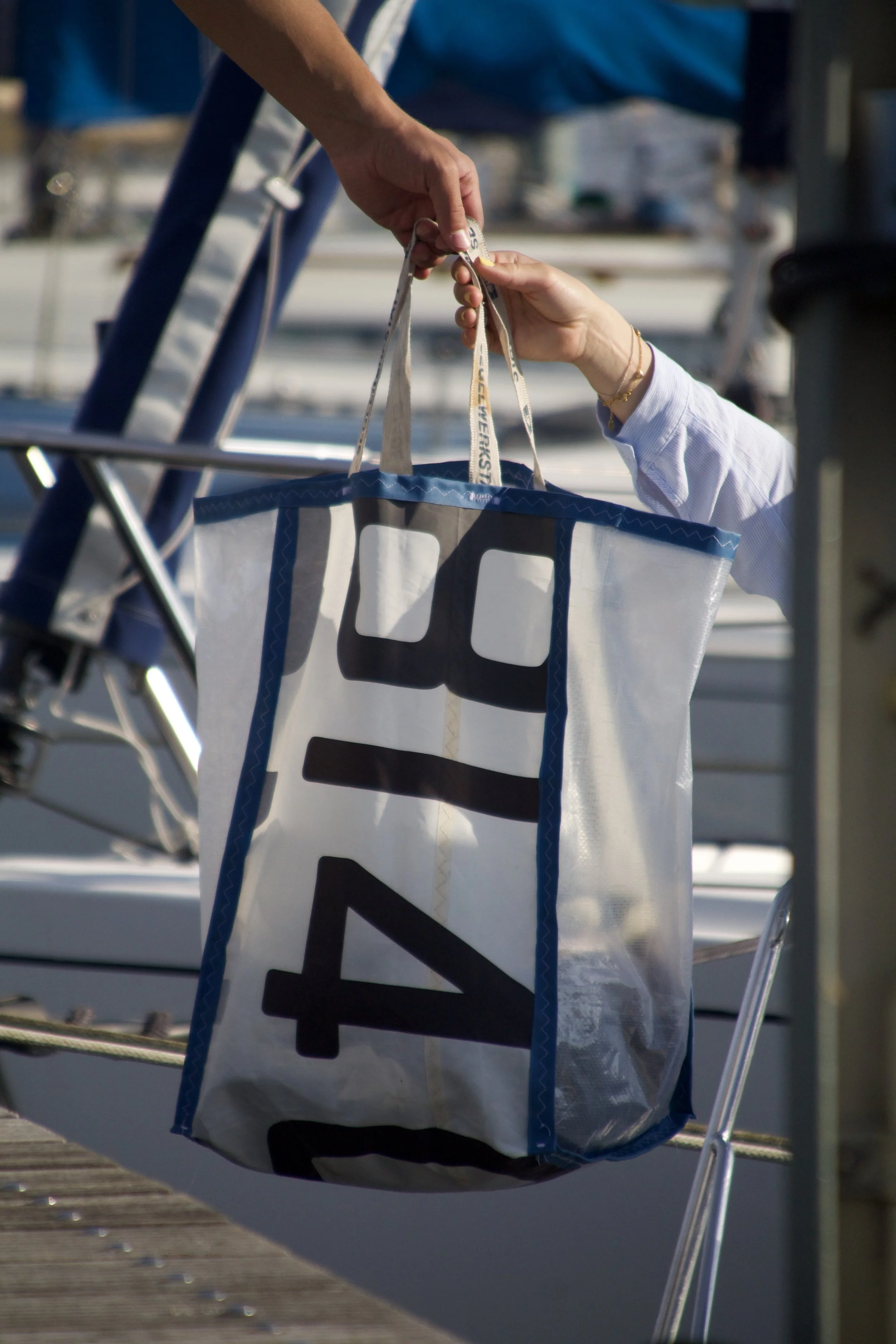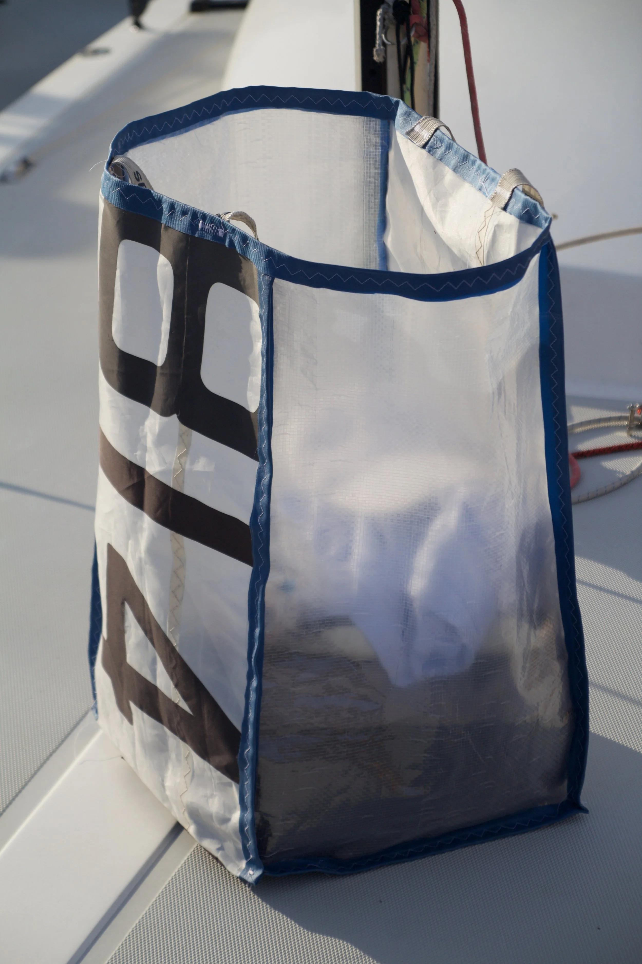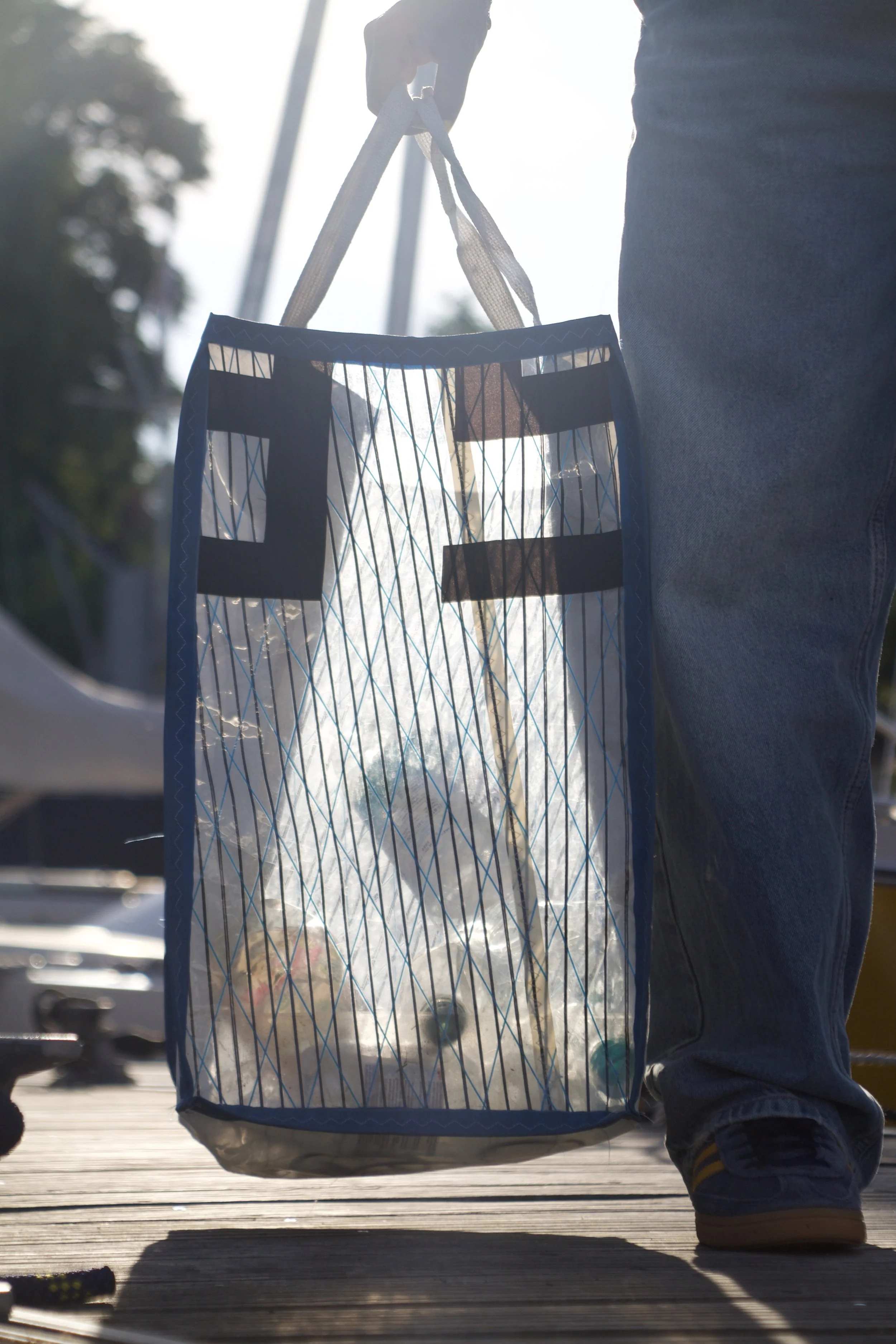 Whether you are out sailing, working in the garden or collecting Laundry, the 45L CleanUp bag is always there for you. Originally it was designed for optimal plastic collection with its large opening at the top, its ability to stand upright on the ground and the large and effective space that is inside. Every bag is unique, since it is made from different sorts and parts of sails, boat and sail covers and textile ribbons.